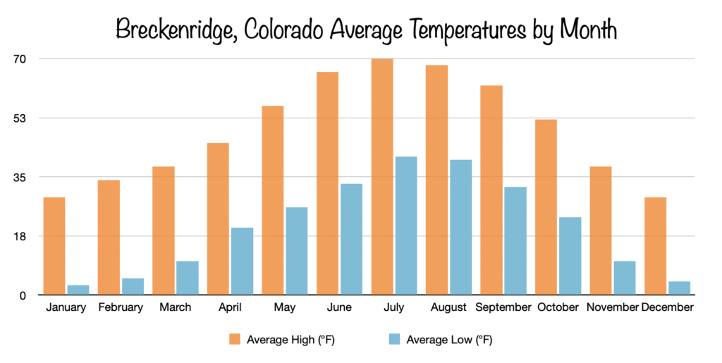 Here is a breakdown of average temperatures in Breckenridge, Colorado. You can expect the Front Range to be warmer than this, while the Western slope is usually a little warmer as well.