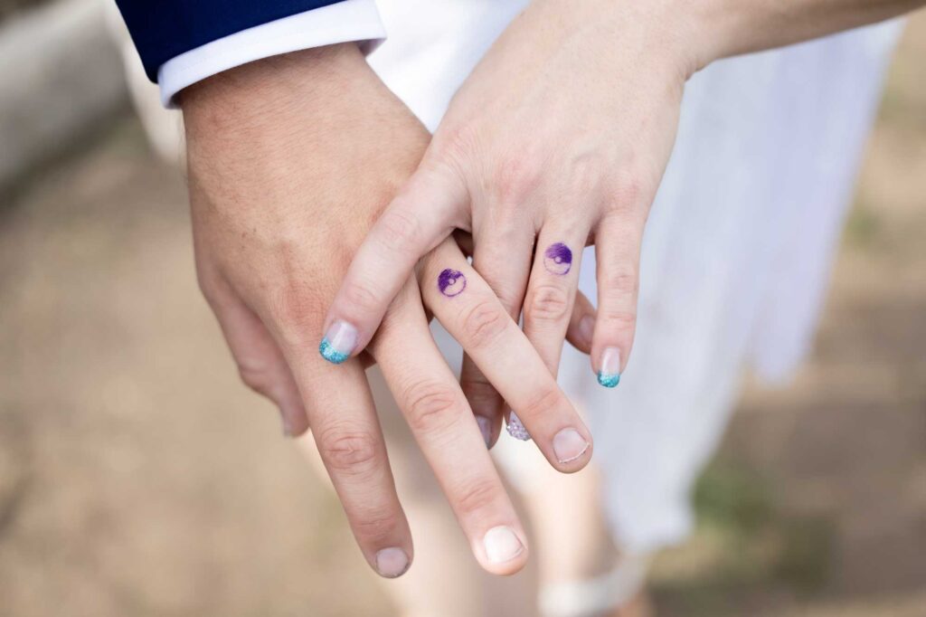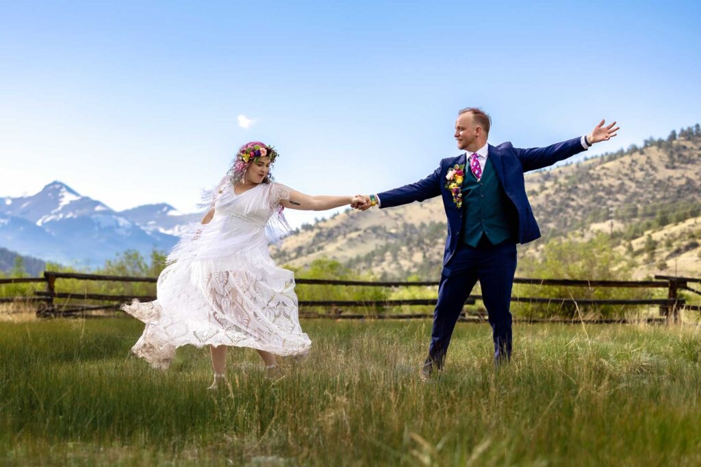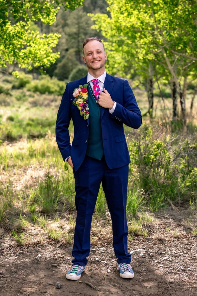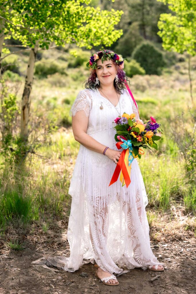 Erin had some amazing vintage details that she wore. Her dress was an amazing lace and tasseled boho dress, and she wore such cute flat sandals to match the summer mountain vibes. The excitement was palpable in the bridal suite. Their dog, Lila Rose, also got dolled up for the big day! She wore a boho wedding dress, an amazing, colorful hairstyle and carried a gorgeous, colorful wedding bouquet. Andy even wore colorful wedding florals on his suit jacket, keeping with the Pride wedding theme.